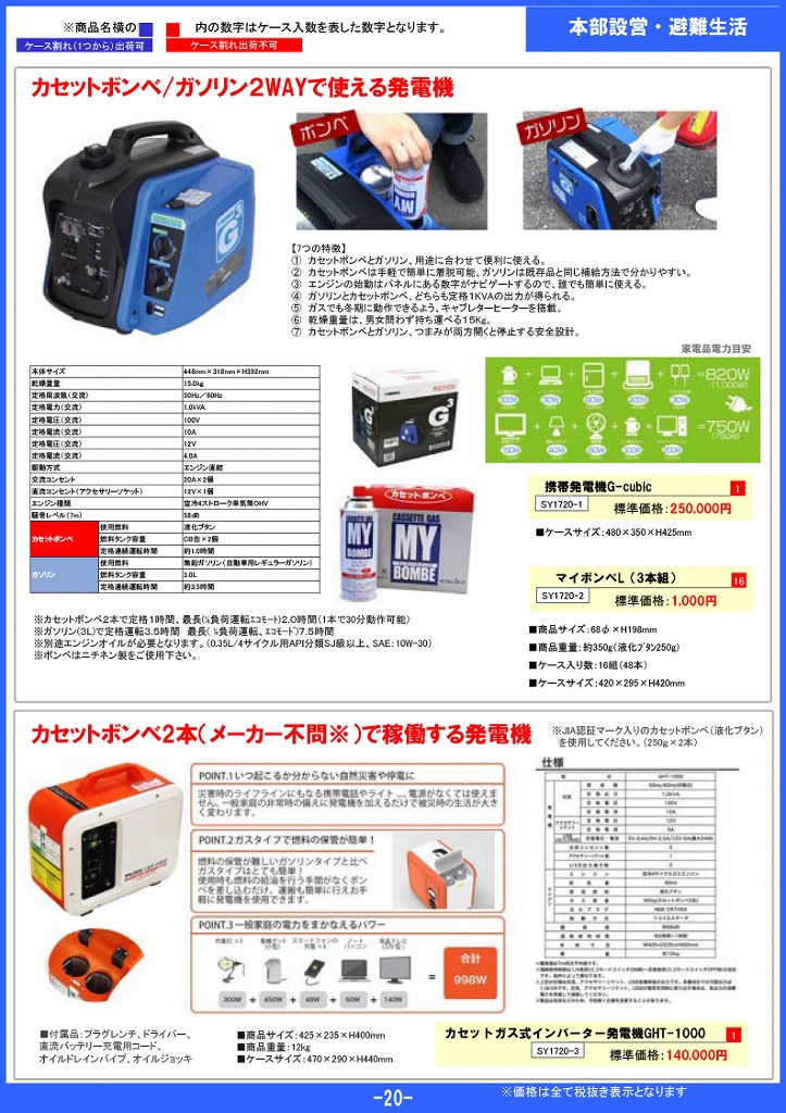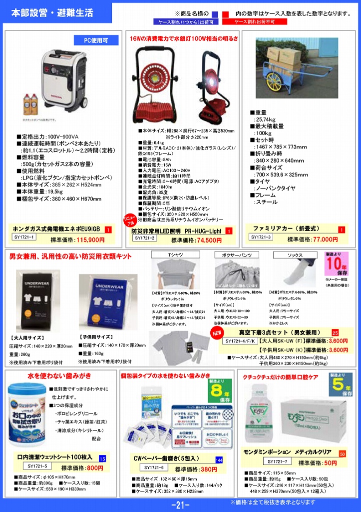 災害対策本部設営用品、生活用品…寝具/テント/発電機/ライト