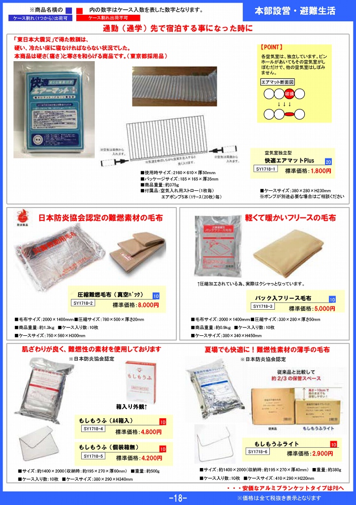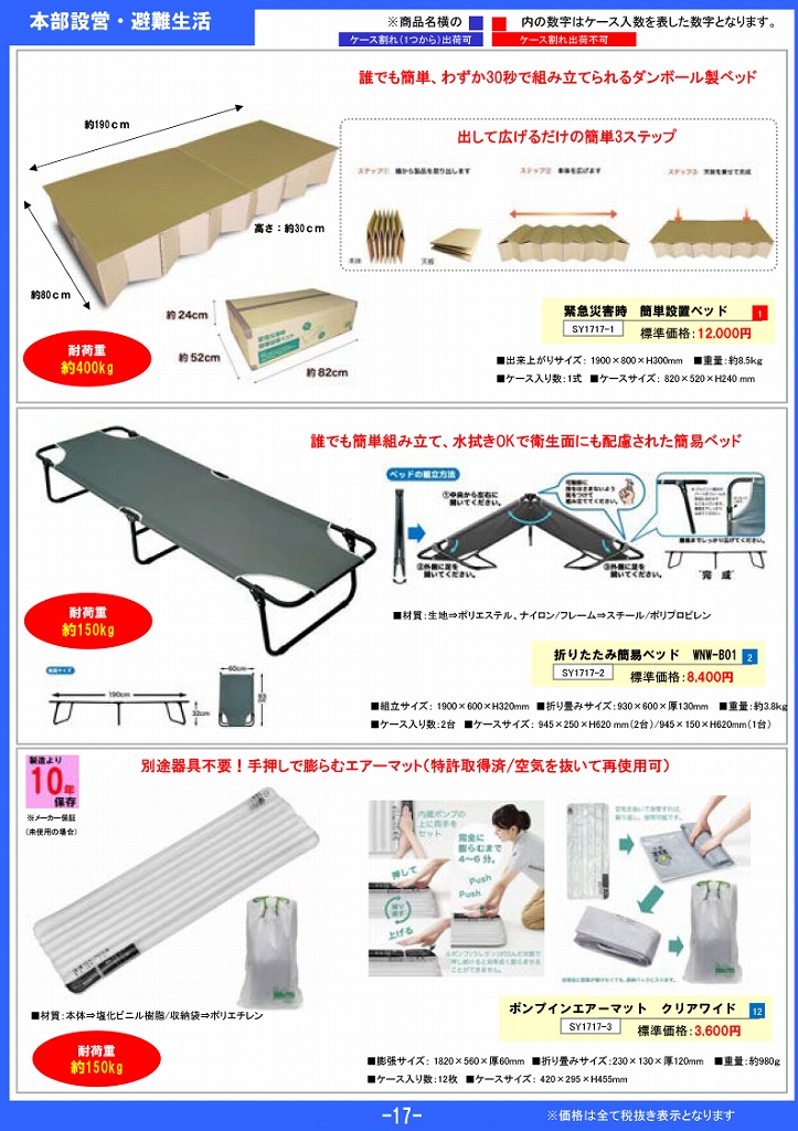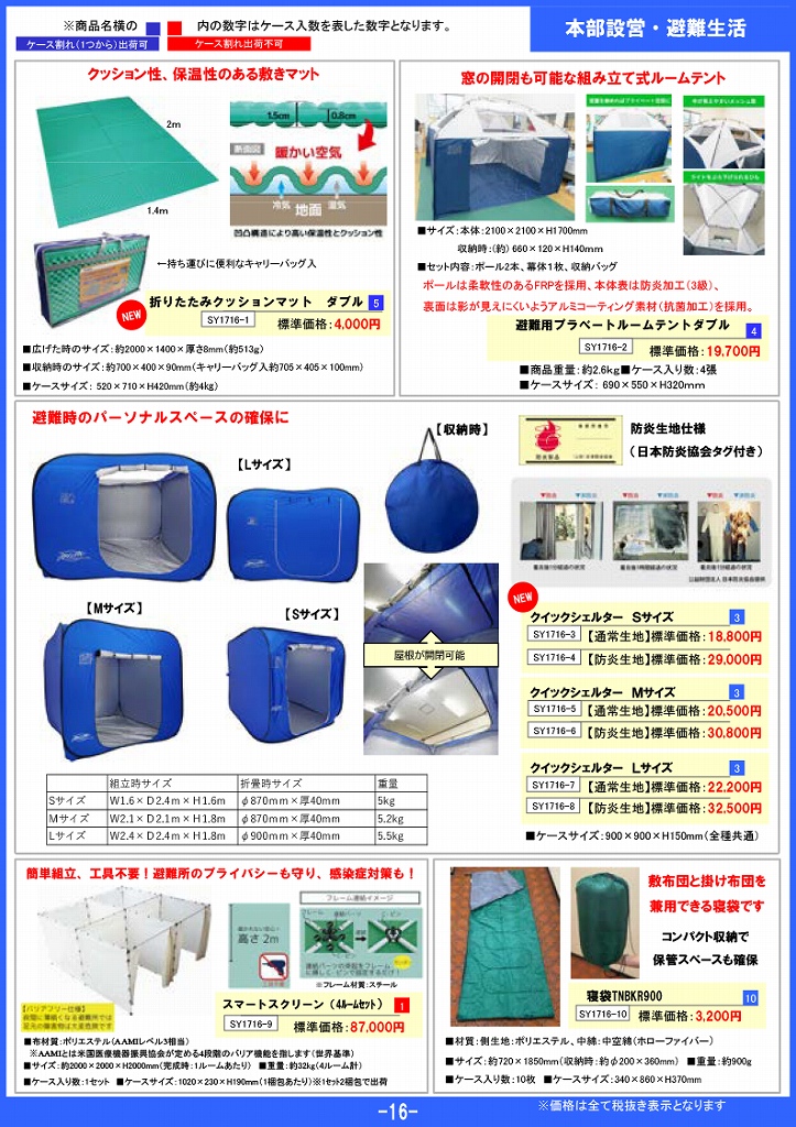 災害対策本部設営用品、生活用品…寝具/テント/発電機/ライト